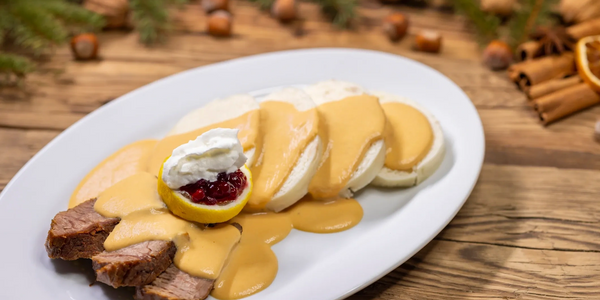 a classic dish of beef sirloin, marinated and served with a rich creamy vegetable sauce and bread dumplings